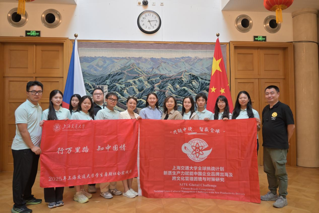 On August 7th, the Czech study and research team of the Global Challenge Program of Shanghai Jiao Tong University, which is dedicated to the research on "New Quality Productivity Empowering Chinese Enterprises' Brand Overseas Expansion and Cross-Cultural Management Challenges and Countermeasures", visited and exchanged with the Chinese Embassy in the Czech Republic. Zuo Wenxing, the Minister-counselor of the Chinese Embassy in the Czech Republic, met with the team and held a discussion. The team was led by Zhang Yifan, the deputy secretary of the Party Committee of the School of Foreign Languages, and included 10 outstanding students from 7 schools, namely the School of Foreign Languages, School of Mechanical Engineering, School of Environmental Science and Engineering, Antai College of Economics and Management, School of Humanities, Shanghai Jiao Tong University - University of Southern California Institute of Cultural and Creative Industry, and School of Education. The team will conduct a 10-day research in the Czech Republic, including enterprise visits, university exchanges, questionnaire surveys, and street interviews, all centered around the theme of "New Quality Productivity Empowering Chinese Enterprises' Brand Overseas Expansion and Cross-Cultural Management Challenges and Countermeasures".
